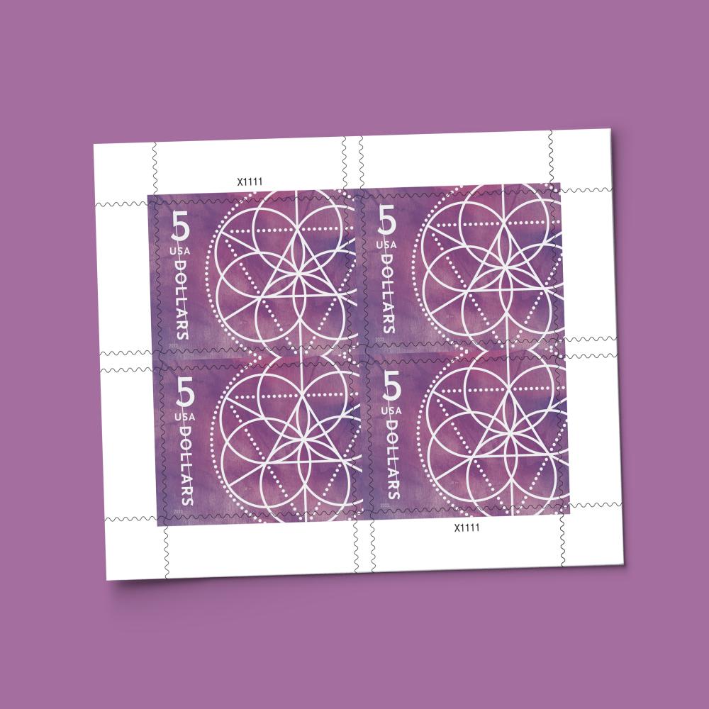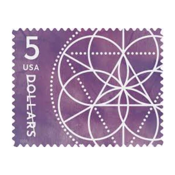 $5 Floral Geometry, an elegant new stamp from the U.S. Postal Service, will lend a contemporary appearance to packages, large envelopes, and other mailings. The $5 stamp is one of two similarly designed high-denomination stamps issued in 2022. The other stamp is denominated at $2.