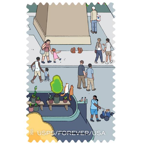 The pane of 20 interconnected stamps show a bird’s-eye view of a mail carrier’s route through a bustling town. Laid out in 4 rows of 5, the stamps depict the story through the 4 seasons from top-left to bottom-right and contain numerous icons representing the Postal Service. Chris Ware created the stamp artwork and co-designed the pane with art director Antonio Alcalá.