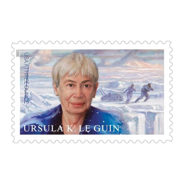 The stamp features a portrait of Le Guin based on a 2006 photograph. The background shows a scene from her landmark 1969 novel The Left Hand of Darkness, in which an envoy from Earth named Genly Ai escapes from a prison camp across the wintry planet of Gethen with Estraven, a disgraced Gethenian politician.